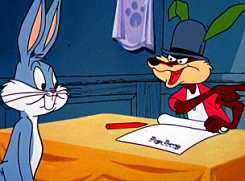 In the titles for his cartoons with Yosemite Sam, with exception of the title cards for "Bunker Hill Bunny", "Lighter Than Hare", "14 Carrot Rabbit", "The Fair Haired Hare", and "Rabbit Every Monday", Bugs was posed with Sam looking up at him menacingly, and the title shown beside them on stage shone upon by the spotlight. For the Tasmanian Devil cartoons with Bugs, a similar duo pose was seen. For some cartoons that featured none of the regular characters (e.g. "One Froggy Evening", "Mouse Wreckers", "Terrier-Stricken", "Two's a Crowd", and "Cheese it, the Cat!"), the title card showed Bugs and the Road Runner standing alongside the lighted title.