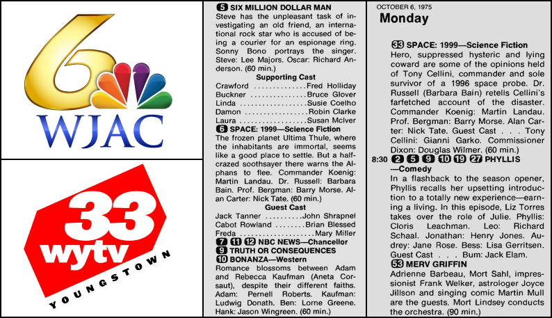 I am not quite finished with the Space: 1999 fiftieth anniversary celebration. I have come upon a Pittsburgh edition of TV Guide with listings for two showings of Space: 1999 on the same evening, that of 6 October, 1975, with synopses that are more elaborate that what I am accustomed to seeing on the pages of TV Guide for Space: 1999's two episodes, "Death's Other Dominion" and "Dragon's Domain". "Death's Other Dominion" was at 7 P.M. that evening on WJAC- Johnstown, Pennsylvania. Channel 6. NBC affiliate. "Dragon's Domain" was at 8 P.M. on WYTV- Youngstown, Ohio. Channel 33. ABC affiliate. WYTV brushed aside ABC's William Shatner-starring Barbary Coast television series for Space: 1999. Here are clippings from that Pittsburgh TV Guide.