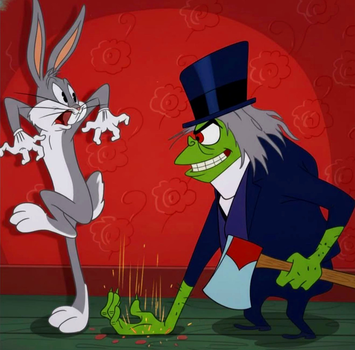 The days leading to Halloween are usually marked on Facebook with many an image of a Warner Brothers cartoon of content appropriate for All Hallows' Eve. And this year, glimpses abound of the cartoons of Friz Freleng invoking Robert Louis Stevenson's "bogey tale". I have come upon one image of Bugs Bunny and Mr. Hyde with the distinctive "Hyde and Hare" Jekyll living room wallpaper behind them. But it is not a screen capture from the cartoon, nor a limited edition cel drawn by a member of the Freleng cartoon animation unit. The drawings of Bugs and Mr. Hyde are not consistent with the designs of those characters for the cartoon under Freleng's direction. Mr. Hyde did not have perfect teeth in "Hyde and Hare" as released in 1955, and Bugs' eyes in this recently encountered picture, bear the look of a Bugs of the mid-1940s. The image looks to be a re-drawing of a scene of "Hyde and Hare" to portray it as though it had come off of the easels of Robert Clampett and his staff. Bugs' eyes look most particularly like those of the Clampett unit's grey bunny. I cannot say that I approve.