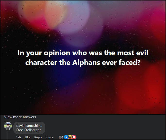 One person came to defence of second season on some other item, and he was immediately subjected to an attempted "gaslighting", with, "Are different opinions of the show something you take personally?" "Yes!!!" I holler! Yes! Bloody damned yes! My attachment to Space: 1999 is deeply personal. It is intertwined quite intricately with my social existence in important eras of my life, eras that define my identity. My reputation is in no small part informed by it. People think of me when they see or hear mention of Space: 1999. They remember my veneration of it. They will use a viewed derision of Space: 1999, on Facebook or wherever, in forming latter-day opinion of me as I was and as I am. And it offends me to be deemed of deficient taste or faulty intellect. It ought to offend anybody. And if these obnoxious fans were not so sorely lacking in self-awareness, they would need not ask the question, for they themselves have identities and reputations intricately connected with their following, for most of their life, of Space: 1999.